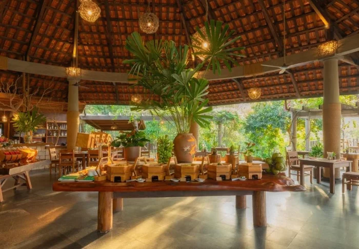 Vom Restaurants und der Bar aus sehen Sie auf den Pool und den Strand. Im Restaurant werden vietnamesische und westliche Gerichte aus regionalen und nachhaltigen Zutaten geboten. Für jeden Geschmack gibt es etwas – auch für Vegetarier und Veganer.