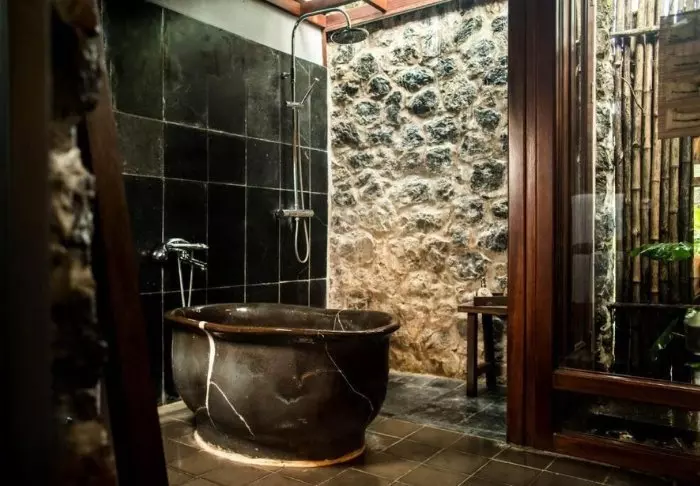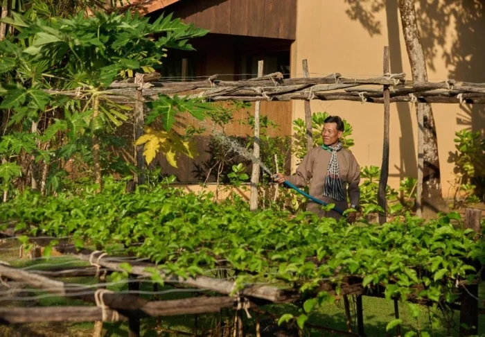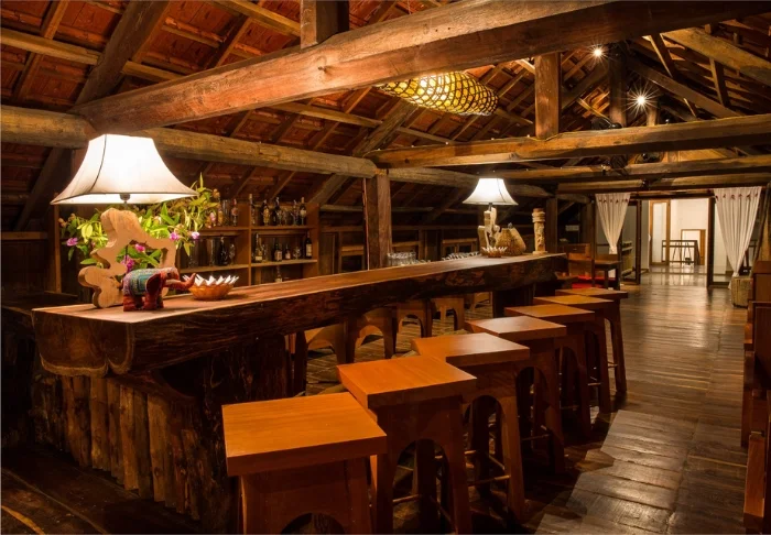 Das Resort wurde umweltfreundlich aus natürlichen und nachhaltigen Materialien erbaut. Ein Großteil des Resortinventars wurde aus herrlichem dunklem Holz in der resorteigenen Tischlerei hergestellt.