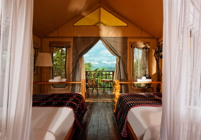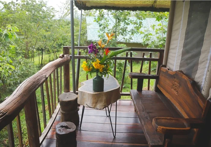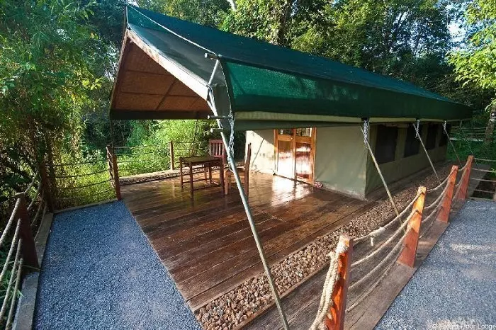 Übernachtet wird in tropentauglichen Zelten, die auf einer Plattform aus Holzplanken aufgebaut sind. Vom Hauptgebäude aus gelangt man über Stege zu ihnen. Die Zelte sind mit Doppelbett oder 2 Einzelbetten, Bad, Mini-Bar, Ventilator und Klimaanlage ausgestattet. Vor den Zelten befinden sich Sitzgelegenheiten, von denen aus man den Sonnenaufgang genießen und den Stimmen der Gibbons lauschen kann.