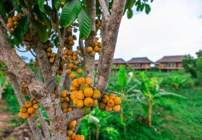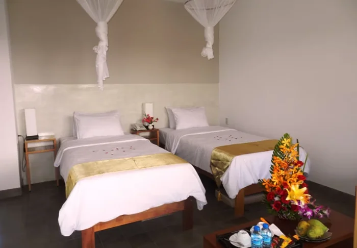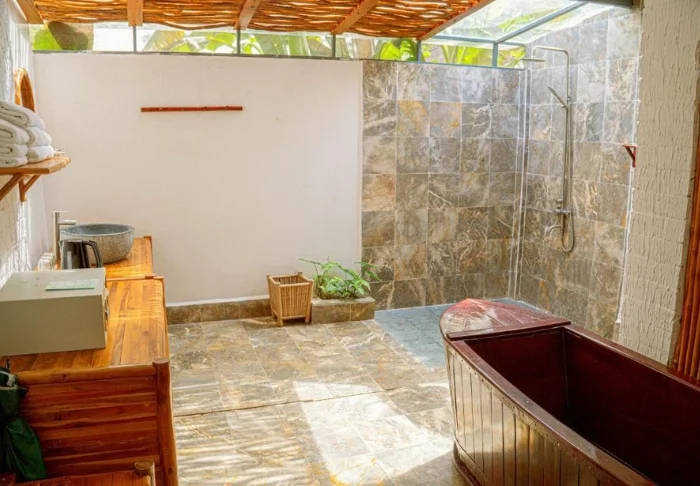 Die Lodge verfügt über charmante Bungalows, die aus Naturmaterialien gebaut wurden und sich harmonisch in die ruhige Umgebung einfügen. Sie übernachten in einem Deluxe-Zimmer, das inmitten der üppigen, blühenden Gärten der Lodge mit vielen Pflanzen und Obstbäumen liegt. Das Zimmer ist etwa 40 m² groß und mit handgefertigten Möbeln aus natürlichen Materialien ausgestattet, sodass eine authentische und entspannte Atmosphäre entsteht. Es erwartet Sie entweder ein Doppelbett oder zwei Einzelbetten, Klimaanlage, Minibar, WLAN sowie ein Wasserkocher für Tee und Kaffee. Das großzügige Bad ist mit modernen Annehmlichkeiten ausgestattet und verfügt je nach Zimmer entweder über eine Außendusche oder eine Innendusche. Auf Ihrer privaten Terrasse genießen Sie den Ausblick auf die friedlichen Gärten und die entspannte Atmosphäre.