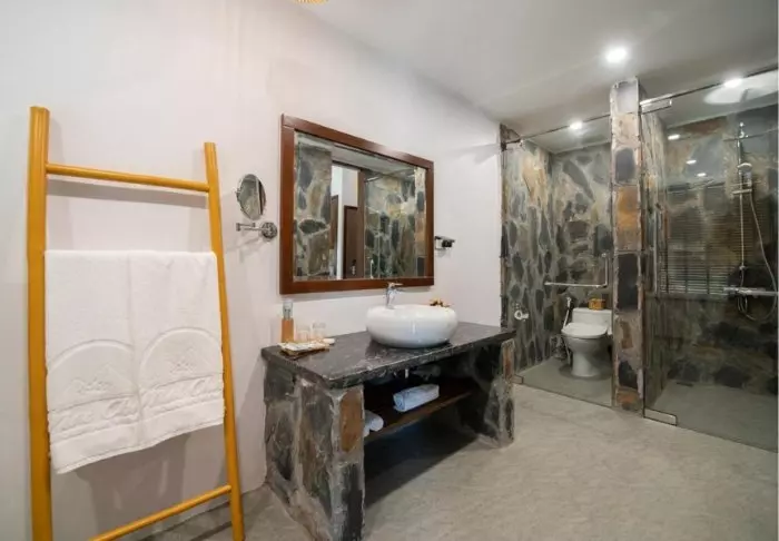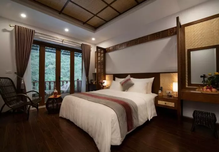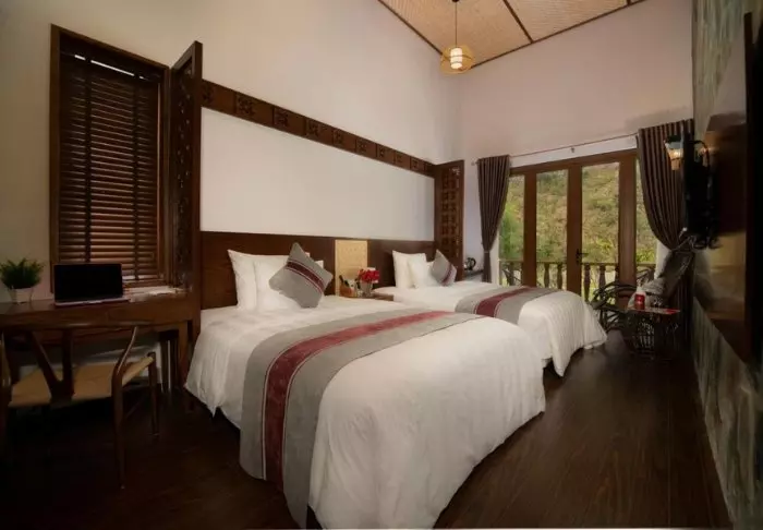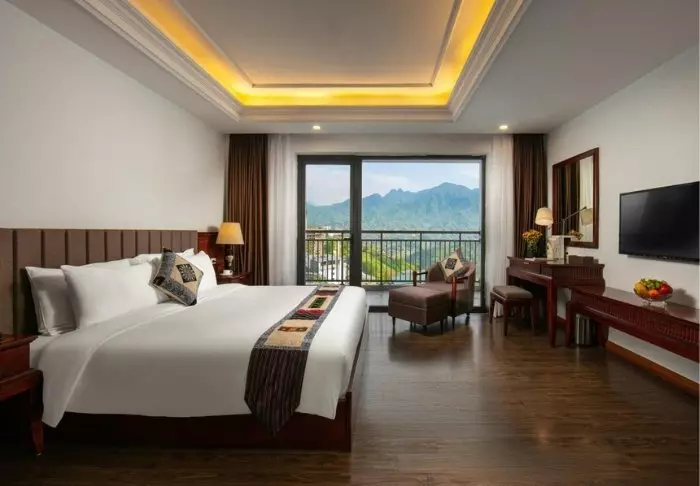 Die 104 Zimmer des Hotels sind geräumig und elegant, in traditionell-vietnamesischem Stil mit dunklen Holzmöbeln eingerichtet. Sie bieten alles, was man für einen komfortablen Aufenthalt so braucht: WLAN, Klimaanlage, Safe, TV-Gerät und eine Sitzecke. Im Badezimmer mit Dusche finden Sie kostenlose Toilettartikel, einen Föhn, Bademäntel und Hausschuhe. Die meisten Badezimmer sind außerdem mit einer großen Fensterfront ausgestattet, die eine malerische Aussicht auf die Landschaft von Sa Pa bietet.