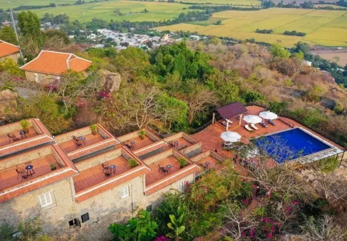Etwas weiter oben am Hang des Berges Sam liegt das Hotel Victoria Nui Sam Lodge. Die Lage ist ein Garant für die schönste Aussicht auf das Mekongdelta mit seinen grünen Reisfeldern, Kanälen und den Bergen an der Grenze zu Kambodscha im Hintergrund.